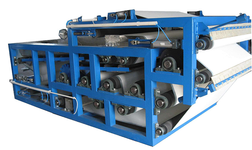 其工作过程是经絮凝处理后的污泥进入污泥布料机构后,首先经重力脱水区,这一段为较长的水平运动段和很小角度的上升段;滤浆在滤带上随滤带一起运动;在重力作用下,自由水与絮团分离,脱除滤浆中大部分的自由水,滤浆基本失去流动性。然后进入楔形空间由小到大,最后两滤带合拢,使夹在滤带中间的滤浆受到的挤压力逐步加大,水分不段地从滤浆中排出。此时泥浆已失去流动性,为下一步进入压榨脱水区做好准备。压榨脱水区的压榨辊按直径由大到小顺序排列,滤浆受到的压榨力由小逐渐增大。经数个呈S形排列的压榨辊对滤饼的压榨、错水剪切后,滤浆脱去大部分的饱和水,完成对污泥的脱水。滤带经过卸料装置时,泥饼被刮刀从滤带上刮落。上下滤带经清洗再生后重新返回重力脱水区,完成下一步污泥脱水循环。